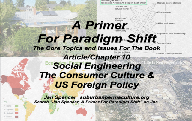 What is Paradigm Shift?; What might a paradigm shift lifestyle look like?; 25 years transforming a suburban property; Various examples of paradigm shift; Eco Villages: Critique of capitalism; History of suburbia; Social engineering; Allies and assets in the community; Ideals and ethics of paradigm shift; Reducing eco footprints; American society is a cargo cult; Paradigm shift – What doesn’t make the cut?; What can one person paradigm shift look like?; Wisdom of the world’s great spiritual traditions; Block Planning; Permaculture and preparedness; Pushing back on cars; Public places in Europe; How to pay for paradigm shift.