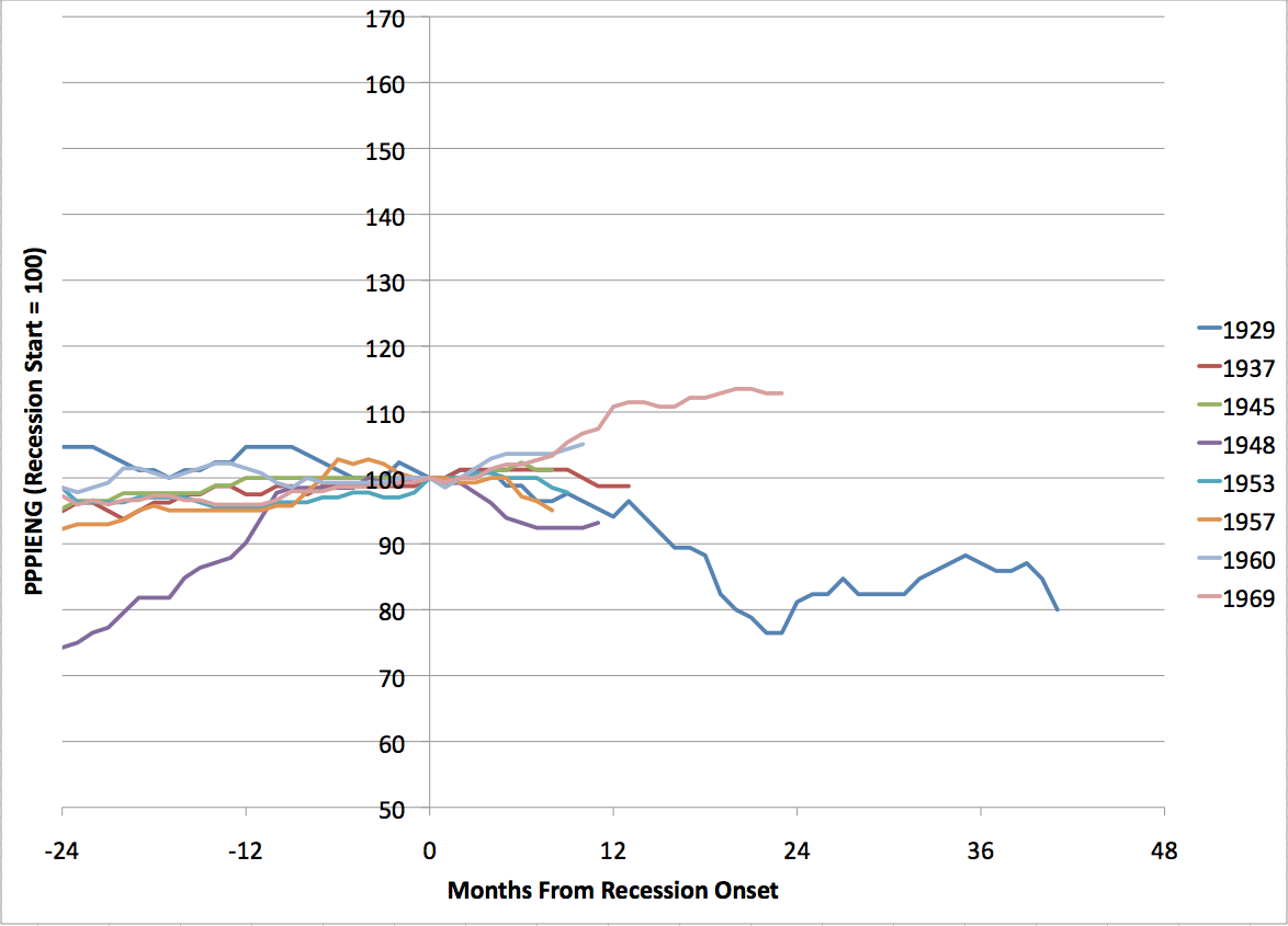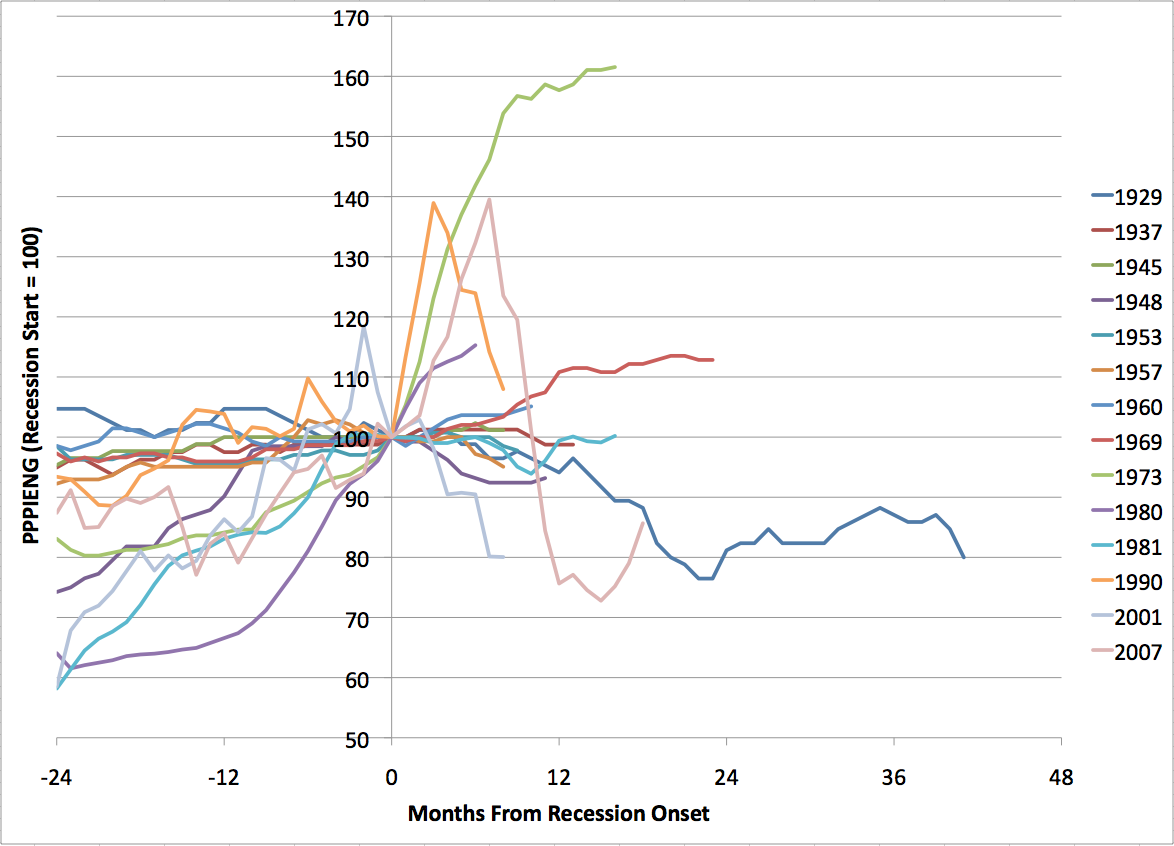 Then for each recession, I took the PPIENG from 24 months prior to the onset of the recession up to the end of the recession (they vary considerably in length). I rescaled it to be 100 at the onset of recession.