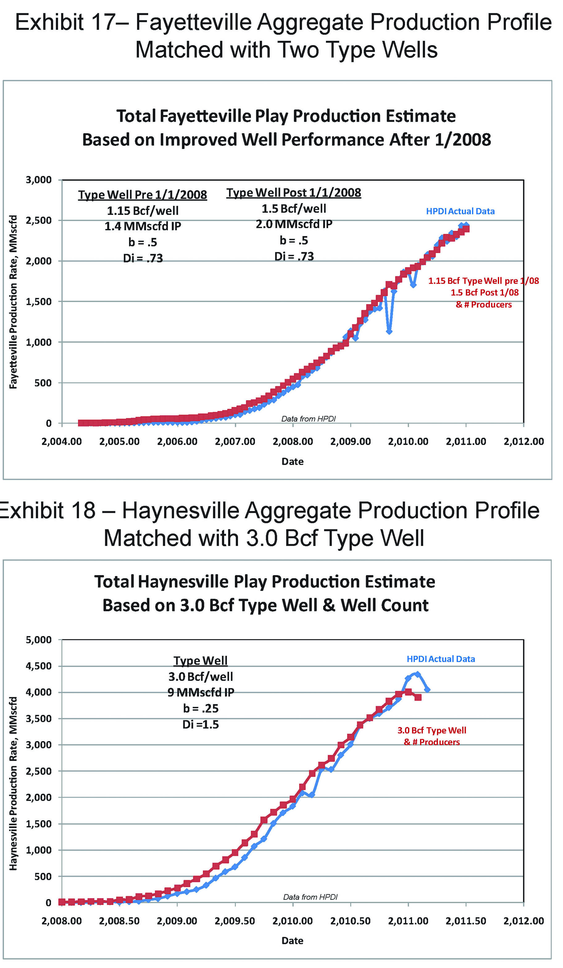 The primary difference between our analysis and the typical well profile proposed by operators is that we observe predominantly exponential (weak to moderate hyperbolic) decline in most of the individual well decline trends, rather than steadily flattening hyperbolic decline. For the Barnett and Fayetteville shale plays, we identify a two-stage exponential decline based on decline curve analysis (DCA) of individual wells; for the Haynesville Shale we observe predominantly exponential decline for individual wells.