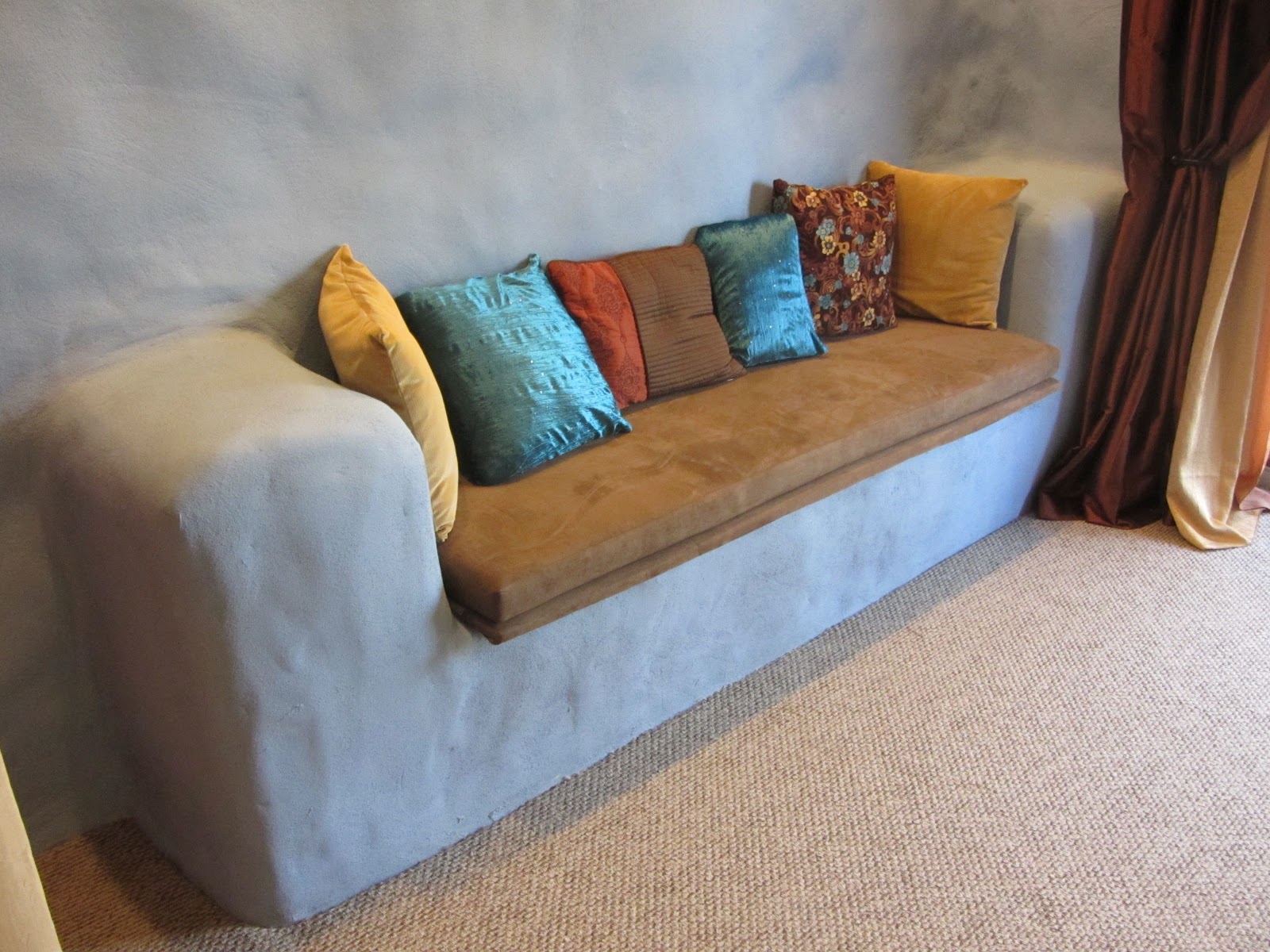 Here’s a shot of the interior of our room, with a bench built into the straw-bale wall: