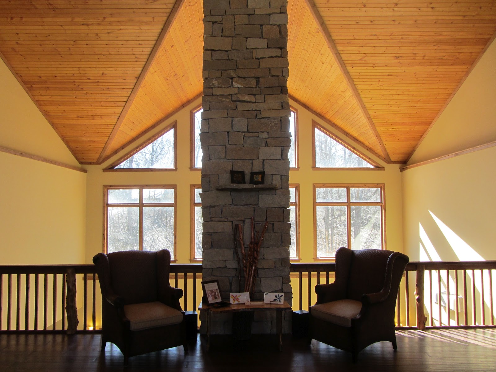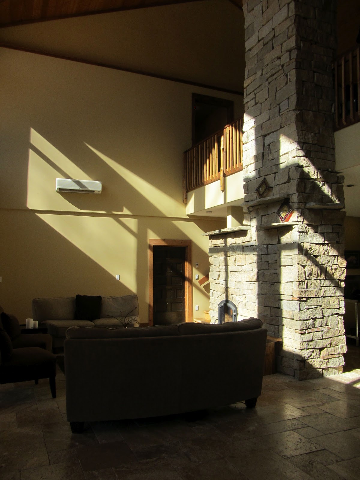 The sun is streaming in through the south facing windows on a sunny day in February and the stone floor and masonry chimney are clearly intended as thermal mass to absorb the heat and then reradiate it later in a classic piece of passive solar design.