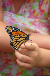 Each of the last two years Clementine and Guthrie decided to “raise” a monarch butterfly. They found a couple of caterpillars on the plants and we put them in a small fish tank with some of the stalks and leaves of the milkweed for food. Within days the caterpillars had suspended themselves from the piece of window screen that served as the lid, and wrapped themselves in the chrysalis that would be their home for about ten days until their transformation to butterflies. When that metamorphosis is just about complete, the chrysalis turns clear, and in less than a day a young monarch emerges, its wings tiny and unfurled at first, but growing to full size literally before your eyes. The whole process takes just a couple of hours. The monarchs usually stay in our garden, close to the milkweed, for a day or two before beginning their lifelong journey south, toward the forests of Mexico.