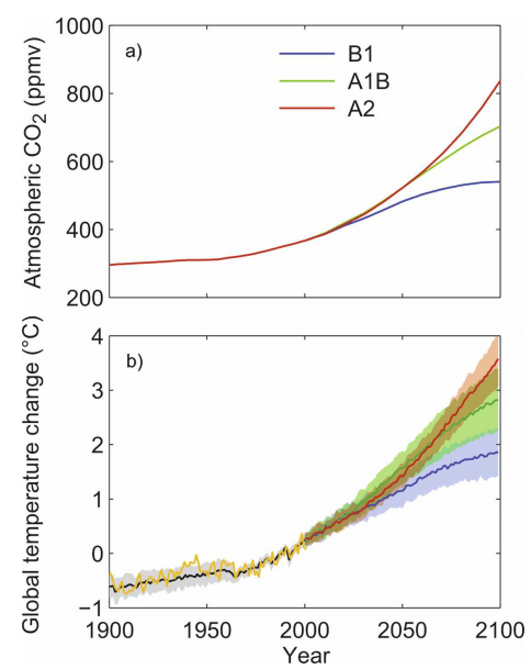 These aren’t the latest and greatest, but the exact details don’t matter to understand the overall shape of the problem. The charts run from 1900 to 2100 – so the present is roughly in the middle. At the top are three paths for CO2 – growing from its pre-industrial value of about 280ppm through values up over 800ppm in the case of the A2 scenario, and stabilizing in the mid 500s by century end in the case of B1. Note that we are currently up to about 394ppm (seasonally adjusted) and still climbing fast.