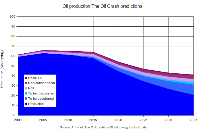 The figure above shows the IEA’s predictions, where it is hoped to arrive to nearly 100 million barrels per day in  2035 (1). These predictions, however, are totally wrong for two reasons: