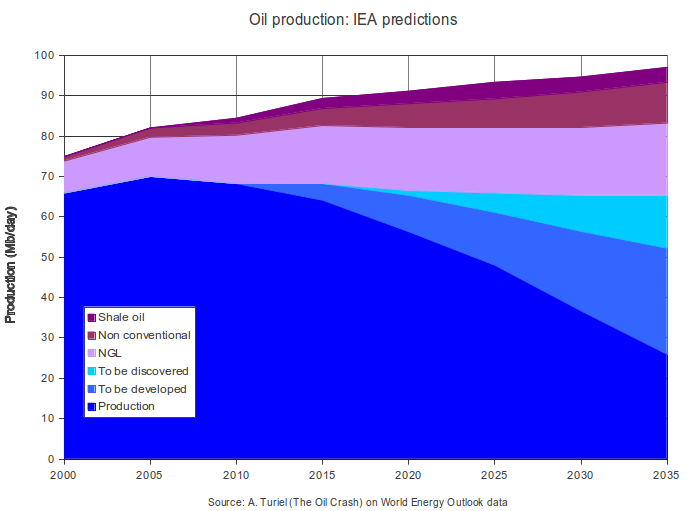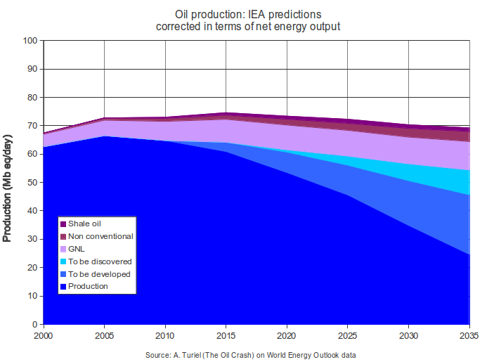 (1) The IEA predictions include also refinery gains, which are not shown here because, as Turiel notes, these gains are obtained at the expense of energy obtained from natural gas.