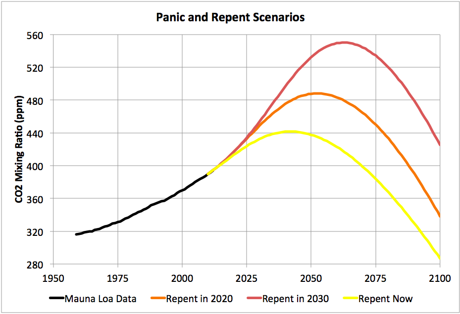So lets define the moment that real repentance begins as that time when we start to noticeably bend the global emissions curve relative to its historical trajectory. In my scenario on Friday, I had this begin in 2020, with global emissions peaking ten years later in 2030. Then I assume emissions actually begin to fall as we deploy renewables and efficiency measures fast enough to overwhelm the growth in fossil fuel usage that would otherwise occur. Eventually, human carbon emissions become negative as we suffer the very serious consequences of the accumulated warming that is in the pipeline and start actively extracting carbon from the atmosphere in an attempt to stabilize the situation.
