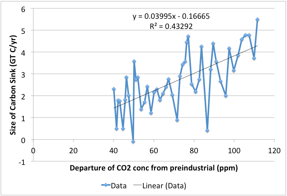 It’s worth saying something about the assumptions that go into the declining phase. So far, not all emissions that we produce go into increasing atmospheric concentration. Because the ocean and biosphere are out of equilibrium with the high concentration in the atmosphere, they pull carbon out of the latter each year. Knowing the mass of the atmosphere, you can compute the size of this carbon sink by knowing emissions, knowing how much the amount of carbon in the atmosphere has increased, and calculating the difference. So far, the sink has been roughly linear in the difference between the current concentration and the pre-industrial concentration: