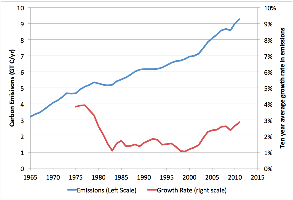 But at the same time, developing countries are rapidly coming into the fossil-fuel age, and the overall result is that the global carbon emissions curve, rather than declining, is going up faster than it has in decades (data from BP):