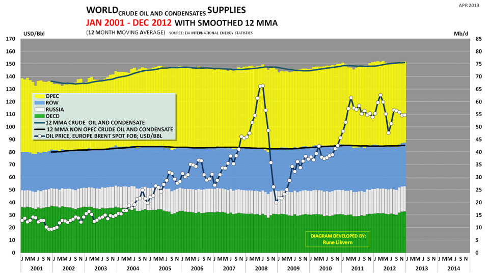 The economic zones are OECD (green), Russia (white), Rest Of World (ROW, which includes Brazil and China) (blue) [OECD, Russia and ROW is also referred to as Non OPEC] and OPEC (yellow).