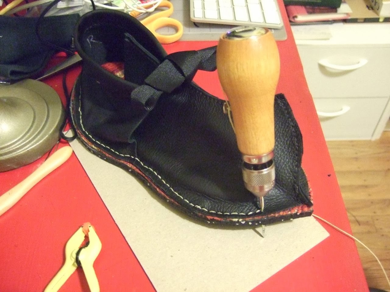 I ordered more leather from e-bay—remnants from upholstered leather sofa making. And I made adjustments to my t-shirt mock up until we were satisfied with the fit. Then I took apart my model and used the pieces as a pattern to cut the shoe parts out of the black leather. Next I had to learn how to sew leather together with the prescribed synthetic sinew. I bought myself the proper needles, a stitching awl, sinew and some non toxic cement. I could use my sewing machine to make holes in the leather that could then be enlarged by the stitching awl; the hand sewing went much easier once I made the holes large enough.