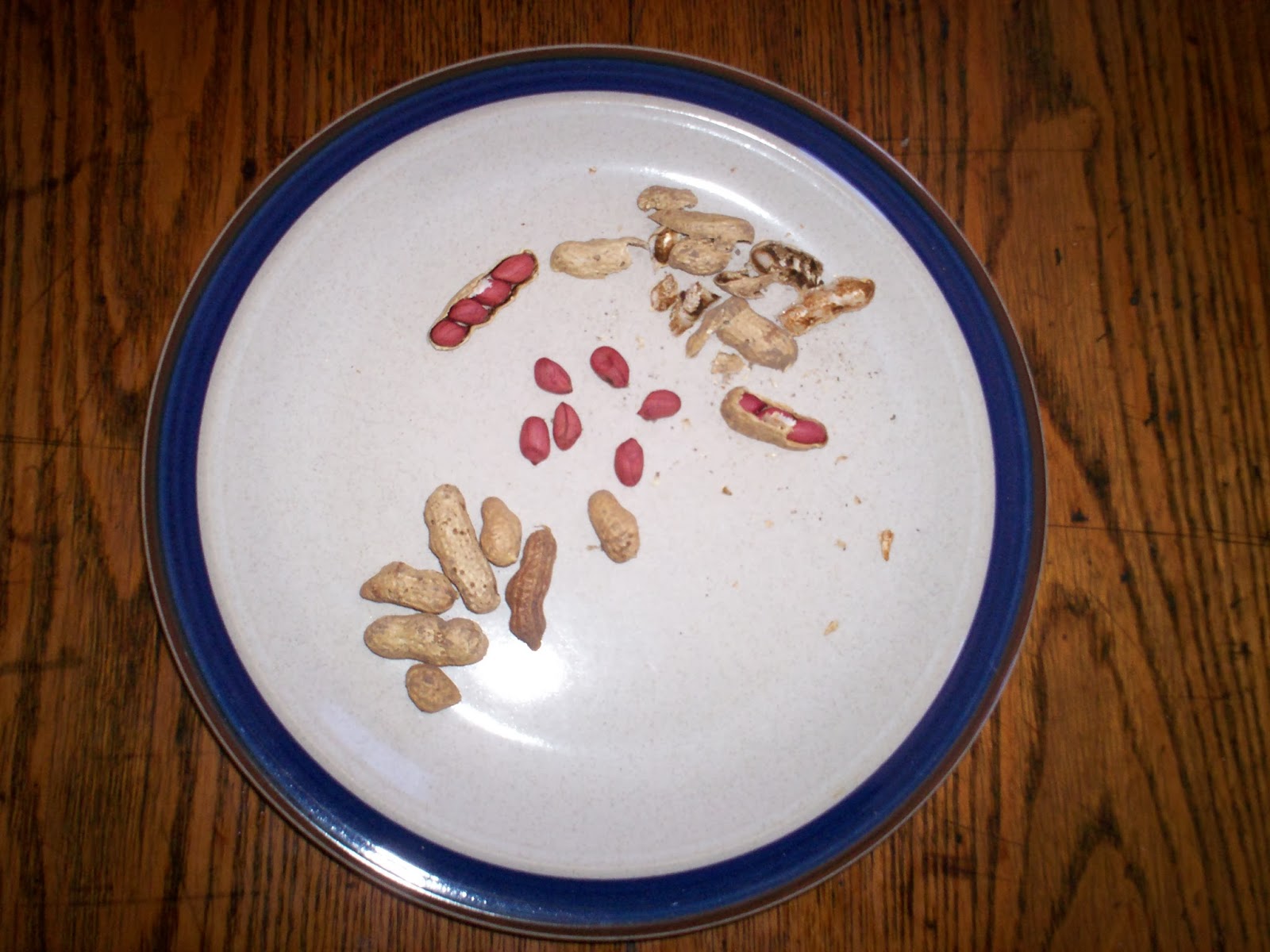 Dawling discusses the proper drying of peanuts at some length due to the danger of aflatoxin developing if the peanuts should mold. She recommends drying them quickly, in the sun if possible or using a fan to blow across them if it isn’t sunny. Because I harvested only about three pounds of peanuts (wet weight), I spread them in a single layer on a window screen that was propped up on both ends so air could circulate under and through the peanuts as well as over them. I did not use a fan to aid drying. I chose not to wash the peanuts before I dried them, thinking that might reduce the chance of their molding. I left them on the screen for several weeks to dry before I put them in a plastic one gallon container for storage prior to roasting. The peanuts appeared to be free of mold, at least any that I could detect by eye, and none developed during storage. The yield of dried peanuts was 5 pounds per 100 square feet, compared to Jeavons’ yield figures of 4 pounds for beginning gardeners, 10 pounds for more experienced gardeners. Not bad for the first year of growing them!