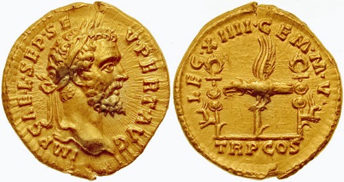 A Roman "Aureus" minted by Emperor Septimius Severus in 193 CE. At nearly 8 grams, the Aureus was truly an imperial coin – the embodiment of Rome’s wealth and power. (image from Wikipedia).
