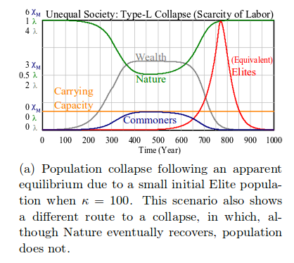 As you see, here society literally commits suicide by having the elites draw so much wealth from the accumulated resources that nothing is left to commoners – who die out. But, as the elites don’t produce anything, the wealth stock disappears and the final result is that they also disappear. The elites are so ruthless that they destroy themselves.