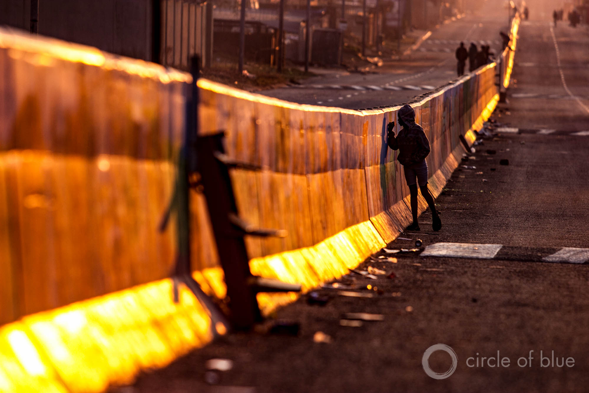 Photo © J. Carl Ganter / Circle of Blue. In 2007 and 2008, South Africa was engulfed by an economic downturn made worse by severe power shortages. With some of the largest coal reserves in the world, South Africa’s political leadership asserts that fossil fuel power still makes economic sense. Here, a concrete median also serves as a barrier between Johannesburg neighborhoods. Click image to enlarge.