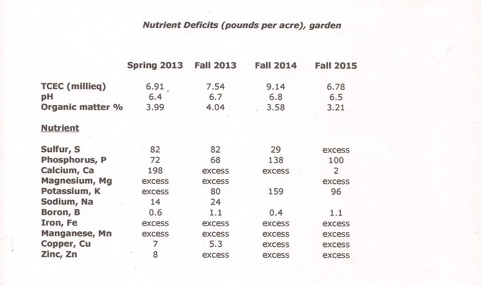 Let’s look first at the soil test results for the 15 beds in the 2013-2015 vegetable gardens and how they changed over the years. Table 1, below, shows the values for total cation exchange capacity (TCEC) in milliequivalents, the pH, and soil organic matter percentage as determined for that sample by Logan Labs. For the spring 2013 and fall 2013 testing I used the acid soil spreadsheet in Steve Solomon’s book The Intelligent Gardener to convert the results Logan Labs reported for each nutrient into pounds per acre of that nutrient. I then determined the deficit or excess for each nutrient from the instructions in Solomon’s book and report the deficit in the table below. The amendment mix is formulated to counteract the deficit in each nutrient. Nutrients in excess are so noted; the soil provides enough of these so none is added. In a few cases the amount present and the amount needed are equal within error; in that case I left the space blank. For the fall 2014 and the fall 2015 testing I used Solomon’s modified acid soil spreadsheet available from this site to determine the amount of the nutrient and its deficiency or excess.