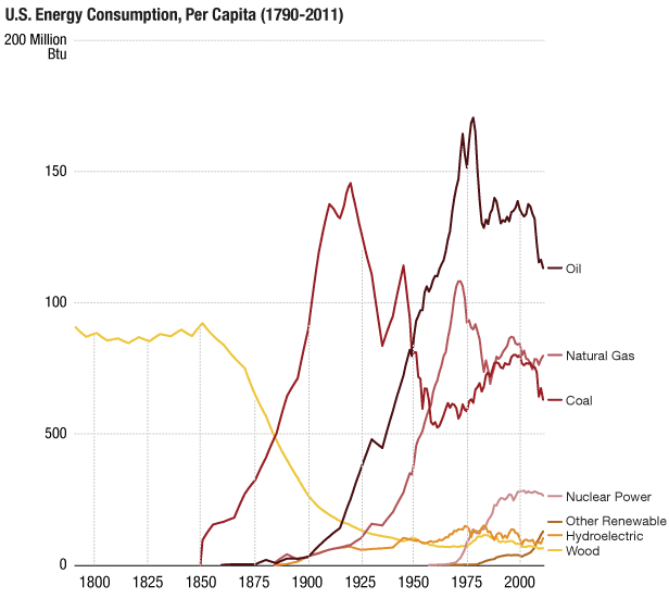 Still, wouldn’t a 100 kwh/person/day energy diet be like going back to the Stone Age? Well, up to 1900, Americans lived on less than that. (Note: chart at right is in BTUs, not kwhs.) Aside from horsepower, most nineteenth century energy came from wood and coal, much of which they burned to power wildly inefficient steam engines and to heat drafty, poorly insulated houses. Today, all of South America, Africa and most of Asia manage to exist with less than 100 kwh/person/day, admittedly with a lower standard of living for the average person. (India survives on just 16 kwh/person/day!) But there are quite a few countries that achieve this energy diet with a comparable standard of living to the present day United States, including Italy (78), Ireland (93), Spain (90), and the United Kingdom (94). And then there’s