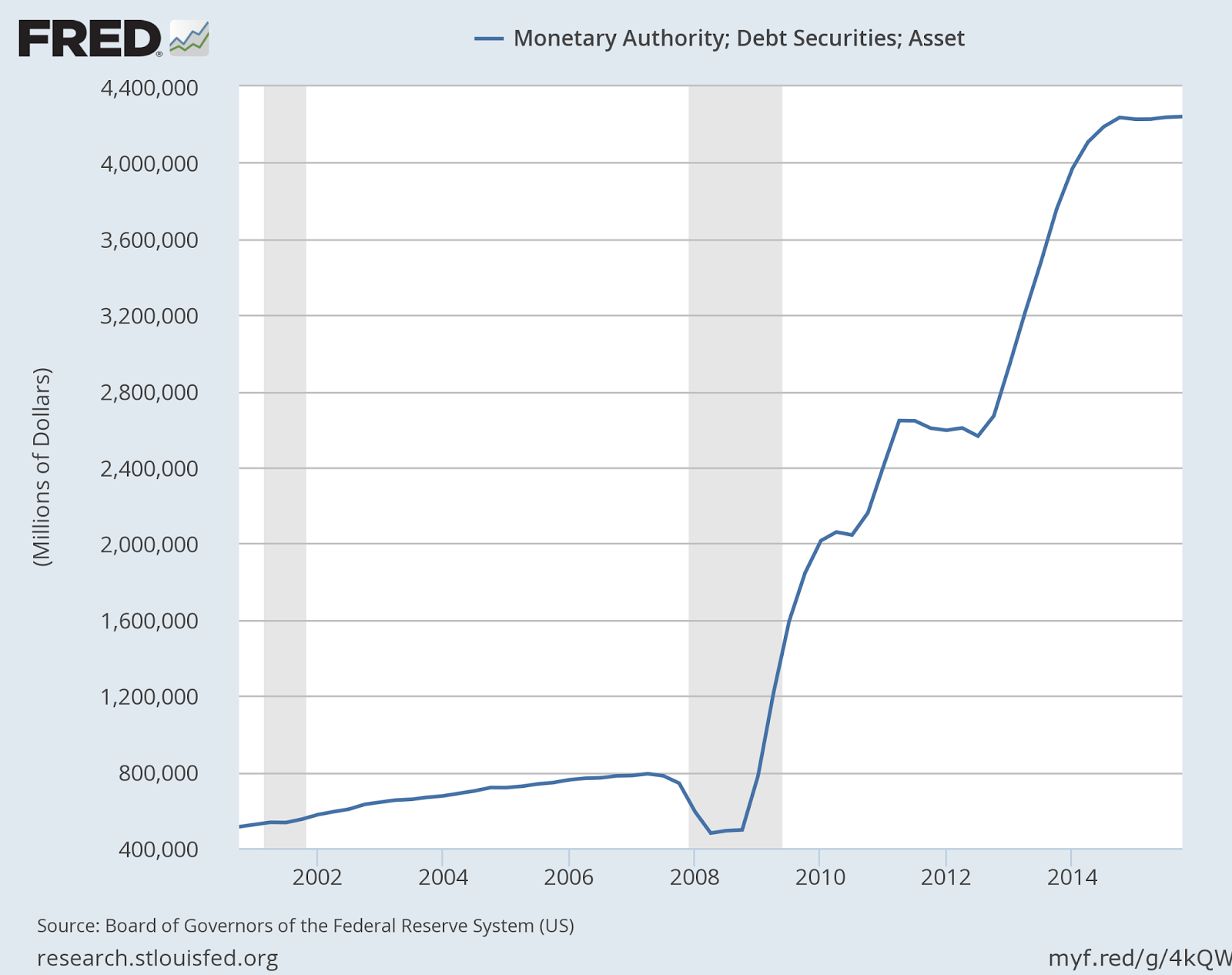 In essence, during the last 15 years the Fed has gifted the US economy with a $4 trillion free lunch. Uncle Sam bought $4 trillion worth of weapons, highways, government salaries and contractual services but did not pay for them by extracting an equal amount of financing from taxes or tapping the private savings pool, and thereby “crowding out” other investments.