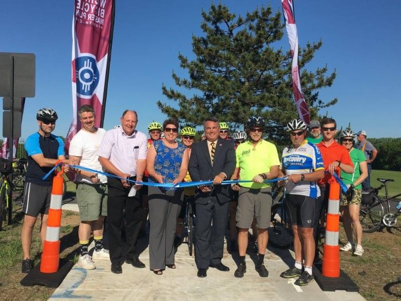 The past week or two have been good ones for bicycling in Wichita. Thanks to the efforts of many people over many months, several long-developed and much-improved bike paths, trails, lanes, and shared boulevards have officially opened of late: Redbud, Prairie Sunset, Chisholm Creek Park, and here on the west side of the city, Woodchuck. (That’s me at the ribbon-cutting ceremony, in the green shorts second from the left; being a member of Wichita’s Bicycle-Pedestrian Advisory Board has its privileges, I guess.)