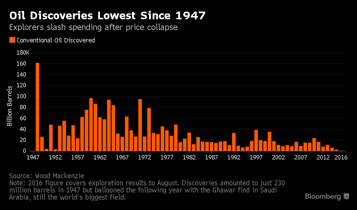 If that sounds too good to you, you are right; this optimistic vision that sees mineral resources as a pie is also firmly placing it in the sky. Just to raise a nagging question, let me cite a report that appeared in 2016 on Bloomberg (not exactly a den of Cassandras), titled “”Oil Discoveries at a 70-year low”.