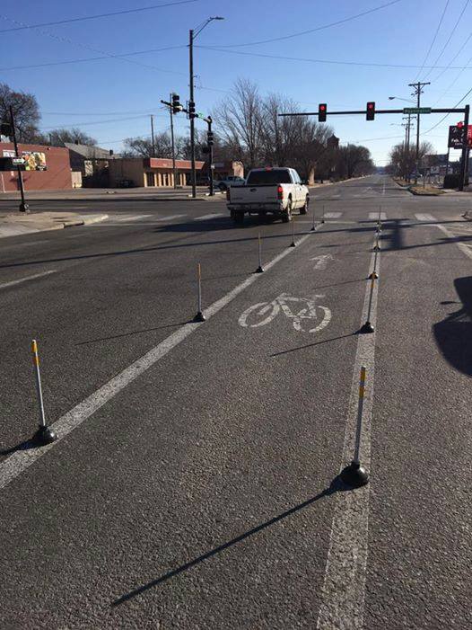 9.) Make walking/biking safer. Support daylighting, the removal of one parking space just before crosswalks. It makes pedestrians much more visible to car drivers, and makes it easier for pedestrians to see if a car is really going to stop for them. In addition, speed kills. Support lowering speed limits on residential streets to 20 mph (“Twenty is plenty”) and adding speed humps to enforce this speed. The main reason people give for not riding bicycles is safety. The underlying emotional reasons are the fear and stress that come from biking next to cars. Support protected bike lanes that create a peaceful, stress-free biking experience even if it requires giving up parking or a lane of traffic. If you really feel gung ho, you could do some guerilla bike lane creation, using plungers to mark off protected territory like a group did in Wichita.