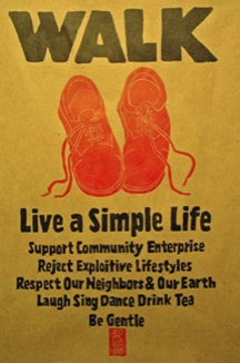 1.) Walk the talk. You cannot expect others to do what you won’t do yourself. Model oil use reduction. In Gandhian fashion, exemplify the change you wish to see in the world. And let it transform you. Yes, initially people may see your new habits as crazy, pointless, etc., but as your life gets better and better—you gain health, you save money, your personal life satisfaction grows, you become pleasantly grounded in your neighborhood and community, slowly your friends and family will take notice. So walk, bike or take transit to places others think impossible. (This isn’t hard: most Americans think walking half a mile impossible.) Arrive invigorated with your trusty stainless steel water bottle, full of amusing stories of your adventures along the way. Sate your hungry ghost. Clear out your excess stuff. Replace the plastic in your house with fewer but more beautiful things. Celebrate local goods and foods. Give them as gifts, and when you have guests to dinner or when you bring food to other homes, point out the tasty, high quality local food the meal contains. (Bonus points for food you grow in your yard.) Through your vitality and obvious satisfaction, you’ll show rather than tell how a life with less oil can be better than one saturated in it.