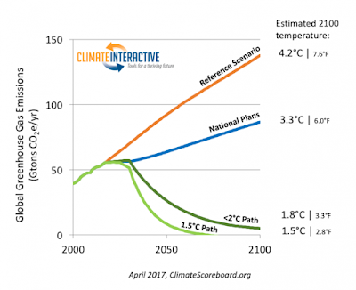 | Paris emissions path (in blue), not accounting for “long-term” carbon-cycle feedbacks (Climate Interactive) |