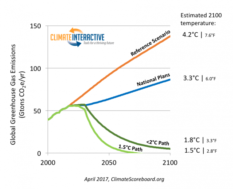 | Paris emissions path (in blue), not accounting for “long-term” carbon-cycle feedbacks (Climate Interactive) |