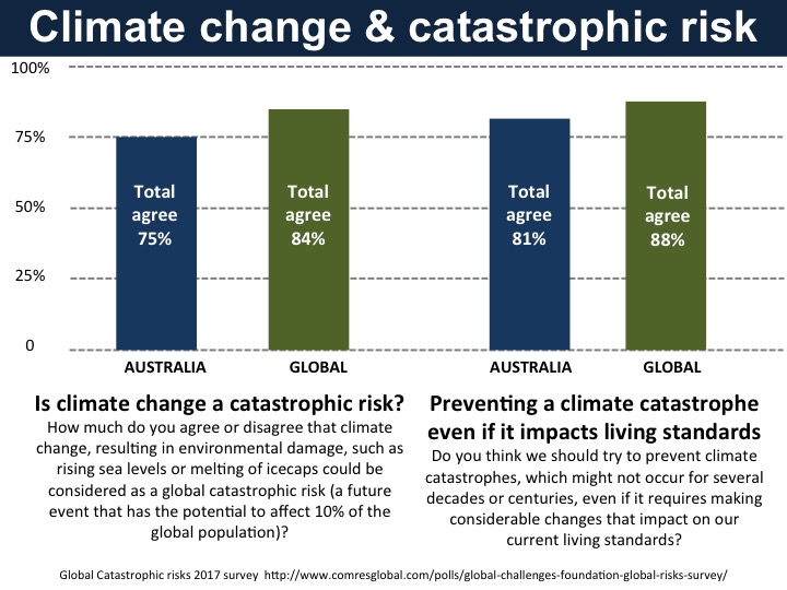 Yet people understand climate risks, even as political leaders wilfully underplay or ignore them. 84% of 8000 people in eight countries recently surveyed for the Global Challenges Foundation consider climate change a “global catastrophic risk”. The figure for Australia was 75%. The GCF report found that many people now see climate change as a bigger threat than other concerns such as epidemics, population growth, weapons of mass destruction and the rise of artificial intelligence threats. GCF vice-president Mats Andersson says “there’s certainly a huge gap between what people expect from politicians and what politicians are doing”.