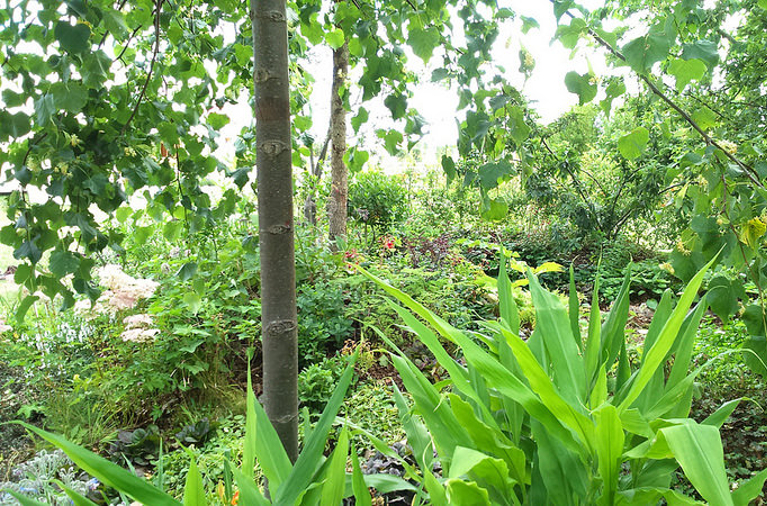 Sitting on top of the flowery mound with my bare feet in the chamomile I could be on a woodland hilltop, but beyond the medlar and hawthorn the bustle of Hampton Court Flower Show is just visible.