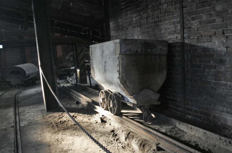 Because this seam is only about five feet high, we have to hunch as we move through the tunnel of presses, stepping through deep pools of water that swallow our boots. The coal-cutting machine is stalled today, otherwise it would be chewing its way along the 310-yard-long seam, mouthparts clamped to the coal like a snail to aquarium glass. The coal would be sluiced away on a conveyor belt to the surface, and the hydraulic presses would inch forward, maintaining space for the miners to work.
