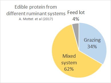 For ruminants, around one third of the protein in livestock products comes from pure grazing systems and 62% comes from mixed systems (system where animals graze to some extent, and where the feed has a considerable proportion of roughage) while only 4% of the ruminant protein come from feed lot systems. For poultry the situation is very different, where only 4% are estimated to be kept in backyard systems, i.e. small scale systems where animals are fed scraps, waste or find their own food here and there. One fourth of the pigs are raised in backyard systems and 56% in pure industrial systems.So poultry certainly eat food that people could eat, pigs as well to some extent, but ruminants are hardly guilty on a global scale.