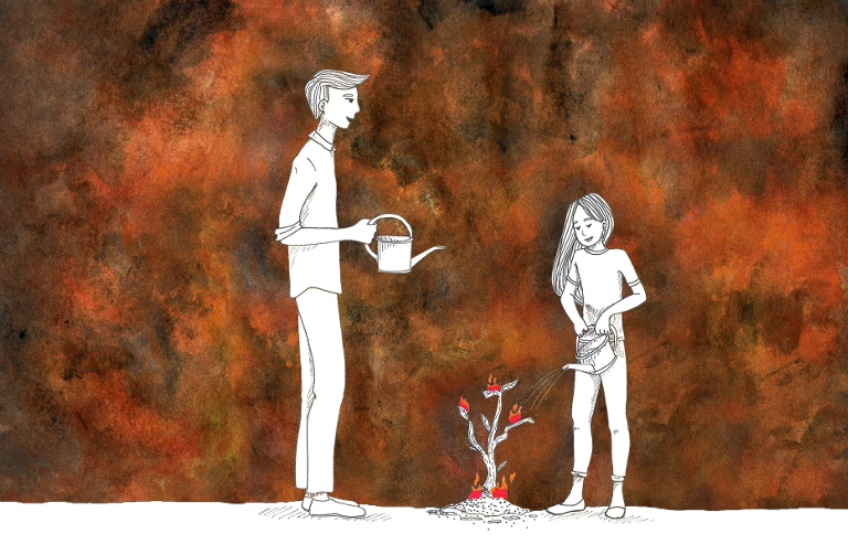 At bottom, I read Being the Change as the testament of a father trying to do right by his kids—a testament that leaves me with a much different set of questions about the psychic wellness of our children: In the face of the climate emergency, what would it do to their psyches to see us, their parents and other adult caregivers, pouring our hearts into the work of personal and societal transformation, on behalf of people we will never meet? On behalf of all other living beings, the rivers and trees and soil? What if our children saw us respond to this crisis with maturity, sanity, and integrity? With the flexible stability of Gibran’s bow? What would it do to them, for them, if we came into resonance with our own souls?