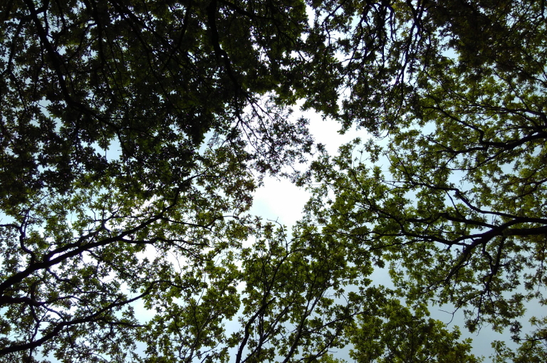 When you look up you’ll see such beautiful patterns, stunning patterns of light through the leaves. In Spring, a beech forest is like a stained glass dome, a study in green. In winter, the silhouettes of trees are just as beautiful. You might even see what Robert MacFarlane (one of the most fascinating people to follow on Twitter) recently called ‘crown shyness’, a phenomenon beautifully captured in this photo from Kottke.org.
