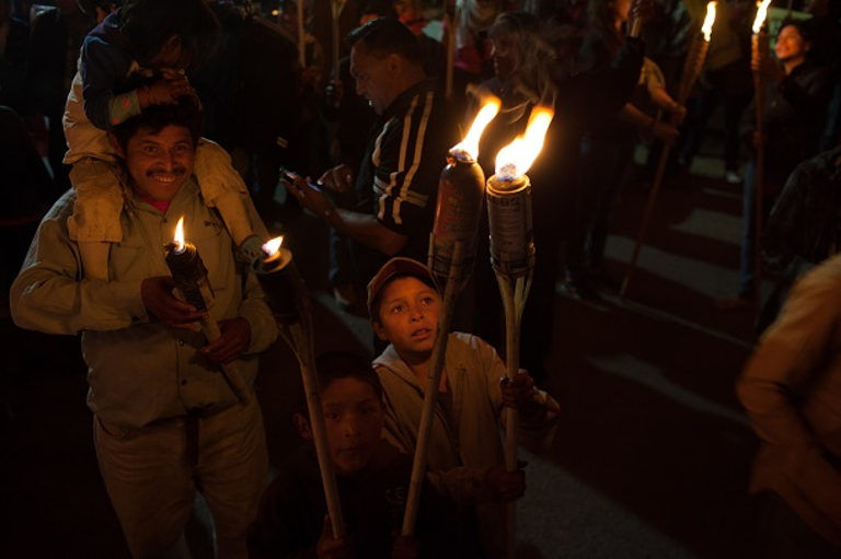 Carrying torches, Cáceres’ supporters marched to the city center of La Esperanza to demand justice for her 2016 assassination. The march was made up of students from the Honduran National Autonomous University, families from the communities organized by the Civic Council of Popular and Indigenous Organizations of Honduras, or COPINH, which Cáceres founded in the early 1990s, as well as international supporters of the late environmental activist.