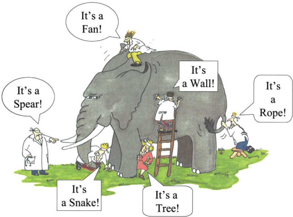 Imagine that we have travelled in time to a not-so-distant future. The elephant has been extinct for a few centuries and the scientists of the time have become blind for some unknown reason. They also have no understanding of how an elephant looks. They come across this strange animal and decide to form an inter-disciplinary team to investigate what it is. An economist investigates the elephant’s trunk and concludes – “It’s a Snake!” A biologist investigates the elephant’s legs and concludes – “It’s a Tree!” A political scientist investigates the elephant’s tusks and proudly proclaims – “It’s a Spear!” A physicist investigates the elephant’s huge ears and hypothesizes – “It’s a Fan!”