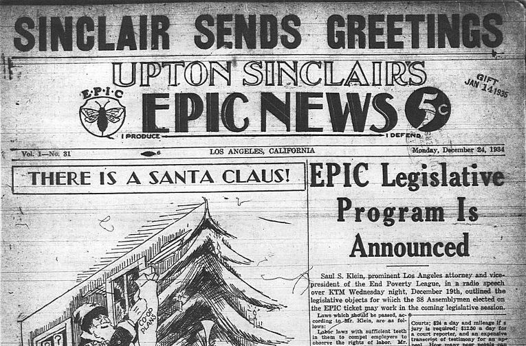 EPIC clubs sprang up around the state like grass after rain, ultimately 2000 of them. The EPIC News reached a circulation of 1.5 million.  But most of the Democratic Old Guard defected to the Republicans to oppose Sinclair. In the midst of possibly the most vicious and libelous campaign in California history, Sinclair went to Roosevelt for support, and met with him. Sinclair recounts the conversation: