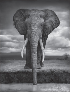 Elephants (killed at a rate of 100 a day for their ivory), lions, giraffes and hyenas, are all photographed with a medium lens camera, as black and white portraits, closeup, still, without drama, or special effects.