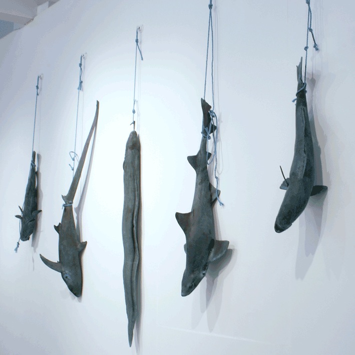 The sculptor Stephen Melton brings a visceral attention to the fate of the natural world at our hands: to native sharks mutilated for their fins (see above in ‘Thanet Fish’) to the illegal pet trade to the destruction of the Indonesian rainforest, with carved and often entwined and adorned figures of animals, birds and fish.