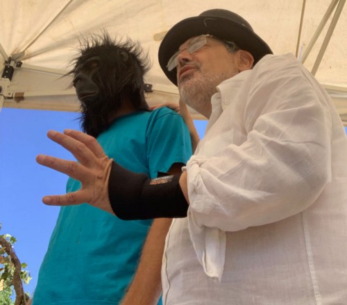 Describing how Herman Melville developed his empathy for the whale, Bardi donned Ahab’s top hat and fastened his sister-in-law inside a raincoat so that her arms were replaced by empty sleeves for fins, then set out with a spear to chase her around the tent.