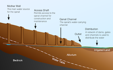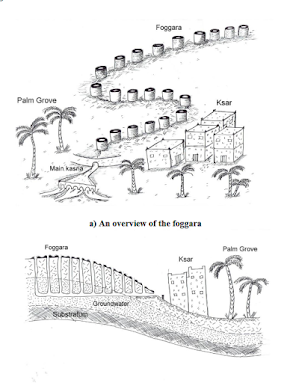 But they were able to prosper by means of a sophisticated irrigation system. It is called the foggara technology in North Africa, in Persian it is kārēz and in Arabic Qanat. (image from Wikipedia)