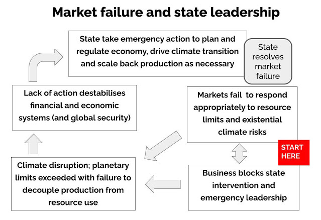 At this point the State — capable of delivering fast, disruptive change — will be forced to respond to systemic exceedance of planetary limits and market failure, take emergency action, redirect current economic behaviour to socially useful ends and scale back production as necessary (see diagram).