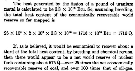 Note the key words: “assuming breeding.” That is, the assumption is that energy can be extracted from both isotopes of uranium, the 235 and the 238. The result is 1700 Quads, or about 100 times the energy content of the (then) known oil and gas reserves.