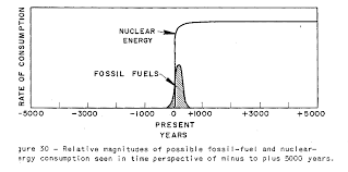 Consider also another problem, much bigger, that lurks unrecognized in the shadows for this scenario. In the 1950s, Marion King Hubbert was working on oil depletion and in 1956 he proposed his famous “bell shaped” production curve, later known as “peak oil.” Hubbert also proposed that nuclear energy would replace fossil fuels. But note in the figure below how, in his view, nuclear energy would not have prevented “peak oil” from taking place at about the same time that was foreseen without nuclear energy. Hubbert understood very well that the enormous effort needed to build the new nuclear infrastructure would have had to be based on fossil fuels, and so would not have reduced their production.