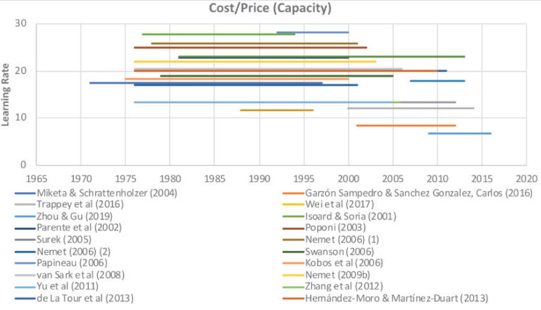 The solar learning rates from the literature we reviewed are shown in the figure below in terms of cost decrease per unit of installed capacity. The length of the coloured line indicates the period over which the average rate was calculated.