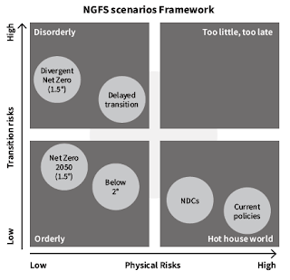Moreover, the scenarios presented by NGFS do not take into account and describe the full range of alternatives. The four key scenarios are based on one set of assumptions: Paris compliant, continued and unsustainable economic growth, a reliance on technologies not yet proven or deployed at scale, overshoot of the temperature target, a big role for gas for many decades to come, and denial of key dynamics of the climate system. No time frame shorter than 2050 is explored, nor any scenarios with active cooling in the shorter term to restore vulnerable ecosystems. This suggests the NGFS  exercise has been largely about mapping a predetermined path.