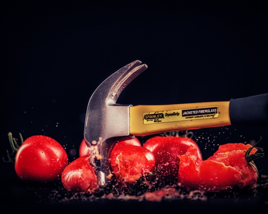 Artist rendering of the conversation between Abe (hammer) and Rob (tomato) (Photo by Khush N, Attribution-NonCommercial-NoDerivs 2.0 Generic (CC BY-NC-ND 2.0)) URL = https://www.flickr.com/photos/commpilot23/9346818666/in/photolist-2i3xKun-2i3xX9A-2i3z5yP-2iVo7cv-2i3wVV9-2iVqRGW-2i3ZsNk-2i3VZEu-3NwokH-2iVo7PY-mugxu-hk12Jy-2i3uxC9-2i3uvNT-4inudu-feWTxY-8X7d8k-3oQB6P-3oQAZD-2kLt7Yy-9S6mBA-3nAP9J-aDgzdB-5K6Rj2