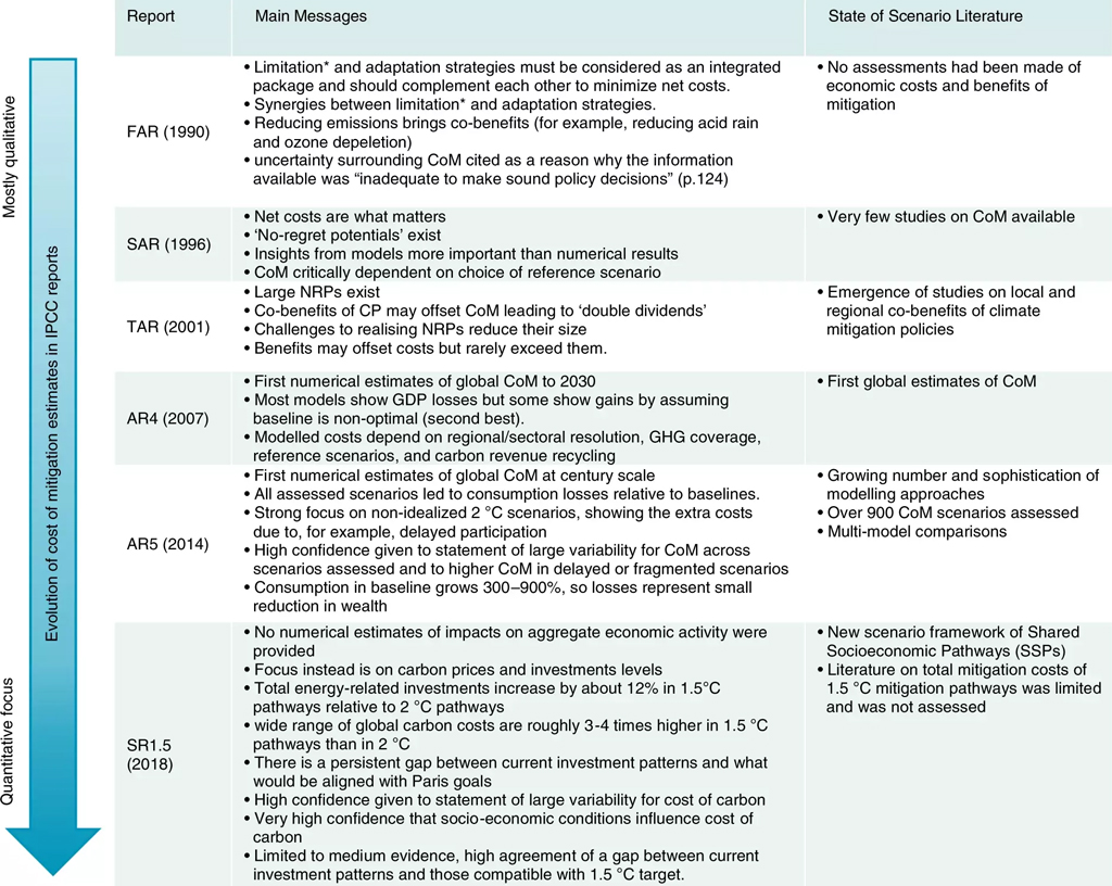 Each successive IPCC report synthesises the main messages emerging from the underlying literature. *Instead of mitigation, ‘limitation’ was the term used in the early days of the IPCC to refer to reduction of greenhouse gas emissions. CoM, cost of mitigation; NRP, no-regret potential; CP, climate policies. Source: Köberle et al. (2021)