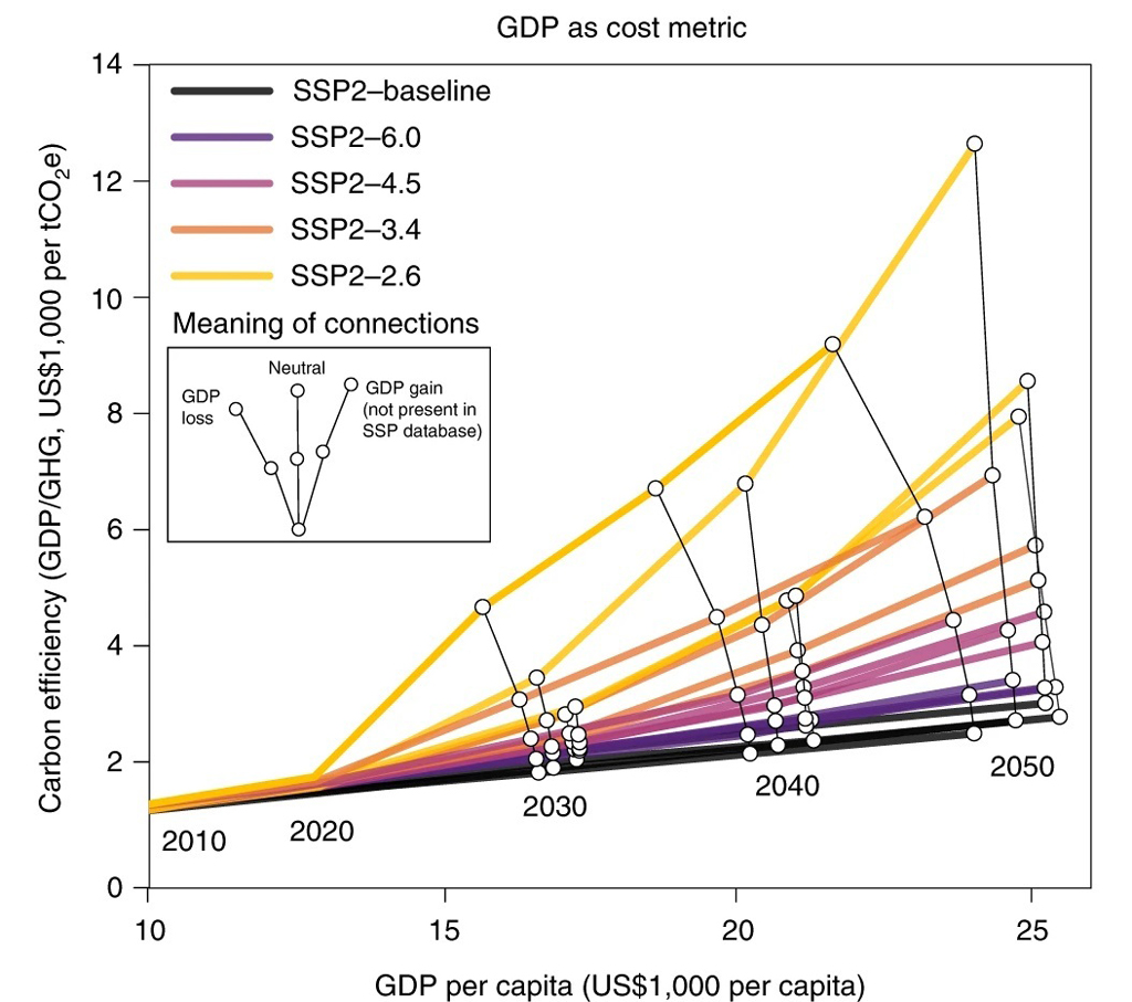 The figure below shows the results from four IAMs with scenarios that combine middle-of-the-road socio-economic assumptions (Shared Socioeconomic Pathway; SSP2) with five different levels of mitigation ambition, as measured by the “carbon efficiency” – the ratio of gross domestic product (GDP) to carbon emissions. Thin black lines indicate per-capita GDP for milestone years for each model. The near-vertical nature of the lines indicate that comparable levels of per-capita income can be achieved even if carbon efficiency increases by a factor of five.