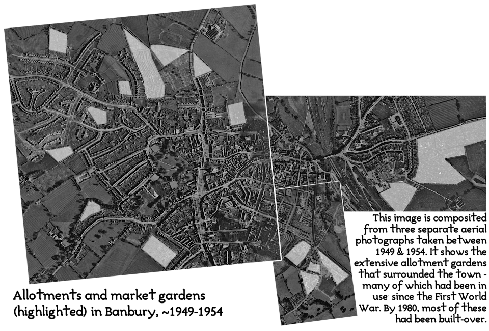 The picture below shows my home town, Banbury, around 1950: ~19,000 people, and hundreds of allotments spread all around the edge of town. Those gardens – some of them operated commercially by people who lived in the town (such as my Great-Grandad) – supplied vegetables, meat, and dairy products to homes and local shops.