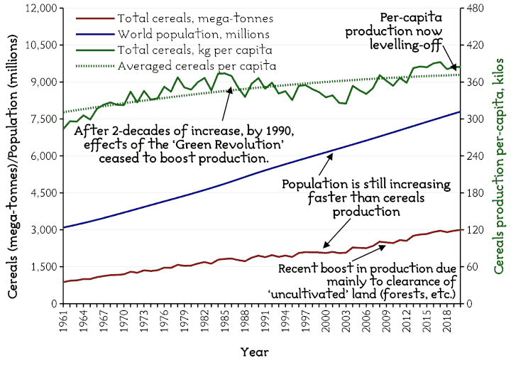 Cereals are not all food, but they are a good indicator of the ‘food system’. When we look at the future trends for global food supply and hunger, cereal production reflects the adequacy of that system as a whole, rather like oil reflects the energy sector.